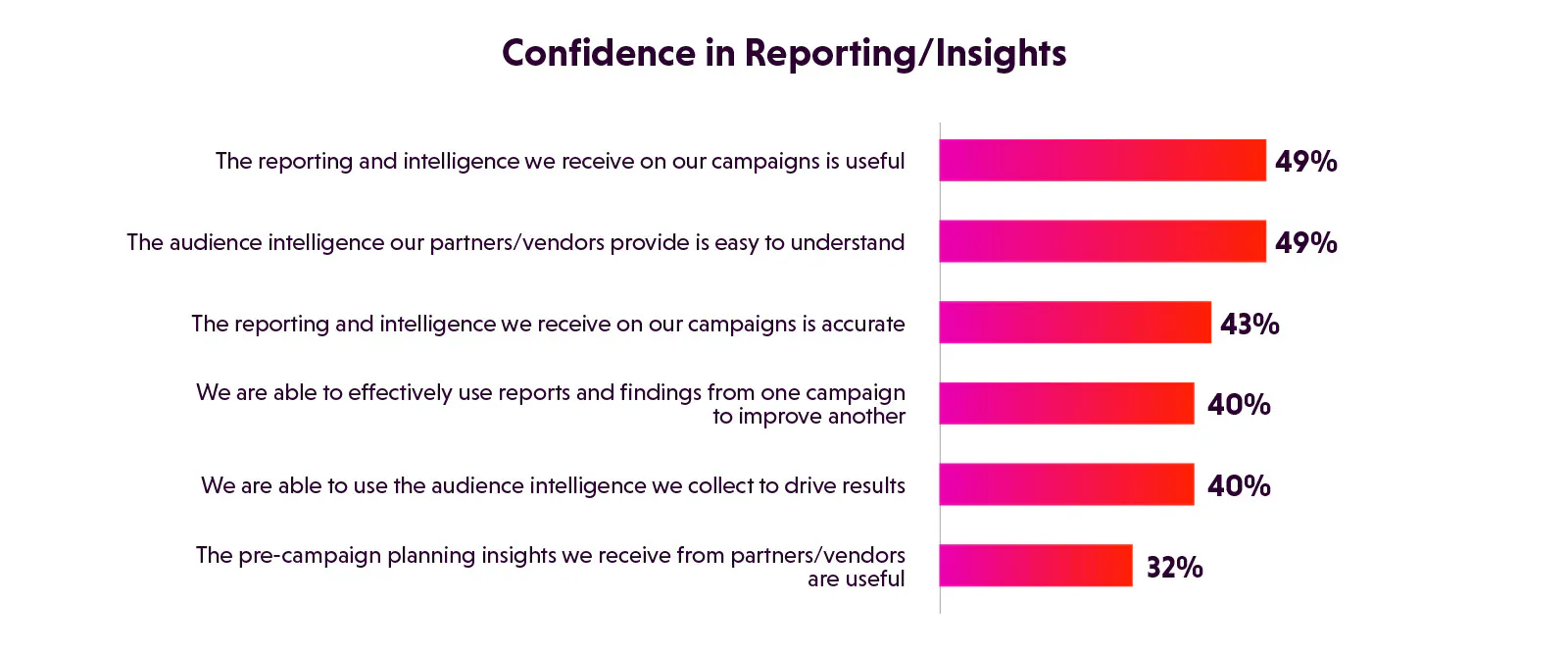 And when marketers have the data connections they need, it’s not guaranteed they’ll be able to use collected intelligence effectively. Only 40% of marketers feel strongly that they’re able to use audience intelligence to drive results. And the same percentage of marketers feel they’re able to effectively use reports and findings from one campaign to improve another - even when recommendations are being made, putting them to meaningful use is difficult.