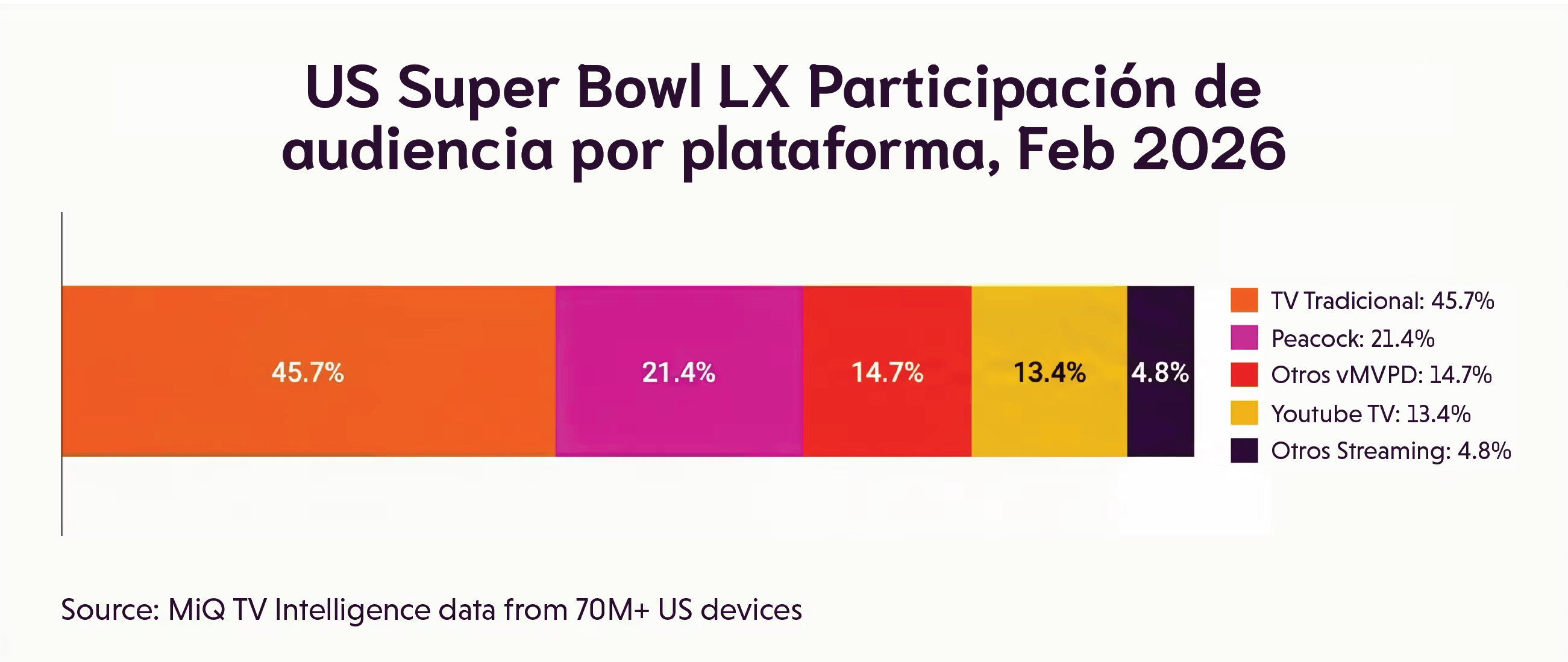 Datos de MiQ TV Intelligence: datos ACR (Automatic Content Recognition) y STB (Set-Top Box) de más de 70 millones de dispositivos en EE. UU., monitoreados a través de la plataforma Sigma de MiQ el 8 de febrero de 2026. El análisis cubre comportamiento de visualización a nivel dispositivo en plataformas de streaming y TV tradicional, incluyendo alcance, duración de sesión, distribución por plataforma y afiliadas de red. Los vMVPD (YouTube TV, Hulu Live, Sling, Fubo) se clasifican como streaming según su método de distribución, experiencia basada en app y accesibilidad mediante plataformas de compra programática. Se excluyó un pequeño número de hogares que consumieron tanto vía streaming como por señal tradicional.