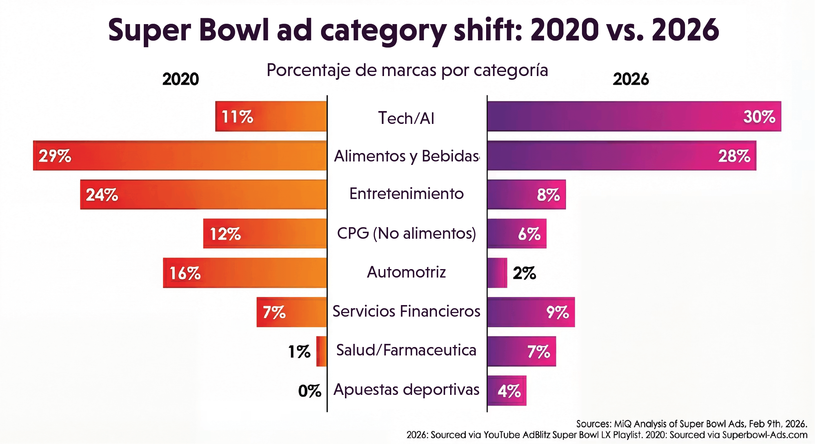 Este auge tecnológico se dio directamente a costa de categorías históricas del Super Bowl. Automotriz, tradicionalmente el vertical ancla del evento, cayó del 16% de las marcas en 2020 a solo el 2%; entretenimiento bajó del 24% al 8%. Mientras tanto, servicios financieros y marcas de salud/farma ampliaron su presencia durante el partido que enmarcó el concierto de Bad Bunny.
